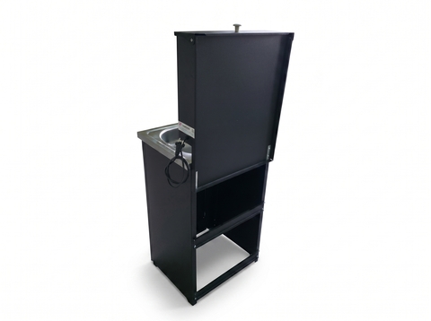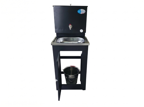 Умывальник выполнен из высококачественной стали  0,7 мм, окрашен прочной краской разных цветов: белый, медь, серебро, лагуна, белое золото.  Конструкция умывальник сборная, состоит из тумбы, которая незаметно скрывает способ отлива воды и позволяет производить отвод воды даже в канализацию, и бака с металлическим шаровым краном, ТЭНом и пробкой для слива воды. Бак обработан гальваническим цинковым покрытием, которое обеспечивает долговечность изделия и исключает появление ржавчины.